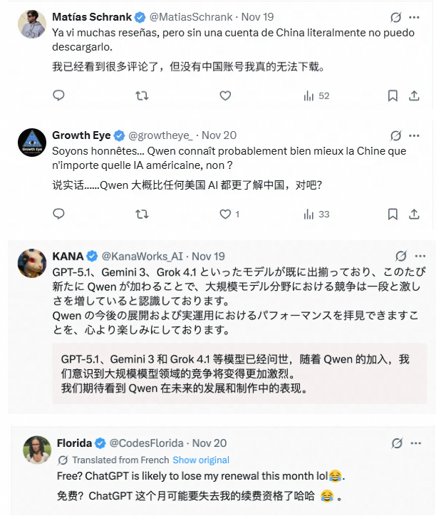 阿里千问APP国内上线后,影响力敏捷分散至海外。11月21日,来自美国、日本、韩国、欧洲、中东等许多海外网友纷繁在社会化媒体上谈论千问APP,等待我国AI能在线帮他们回答数学问题、教授民间传统文化、写短剧剧本,乃至教会他们我国菜食谱和我国功夫。海外网友在线催更免费的千问APP在他们国家上线,“这样就能停掉ChatGPT付费了。”